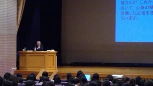 弁護士の川人博先生にご講演いただきました。先生は様々な統計やデータを用いて、過労死をめぐる現状や、労働者を守るためのワークルールについてお話くださいました。生徒たちは、自分が将来、健康に働き続けるためにはどうすれば良いのかを深く考えることができました。